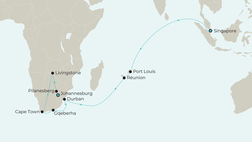 From white-gloved waiters and red-cloaked bell boys to roaring lions and thundering cascades, this adventure pairs classic Cunard elegance with the drama of Africa. Feel the mist and power of Victoria Falls across three signature experiences — the Royal Livingstone Express, a guided walking tour, and a sunset cruise on the Zambezi — then seek the Big Five* on safari in Pilanesberg. Your voyage aboard Queen Victoria links it all together with refined comfort and enriching ports.